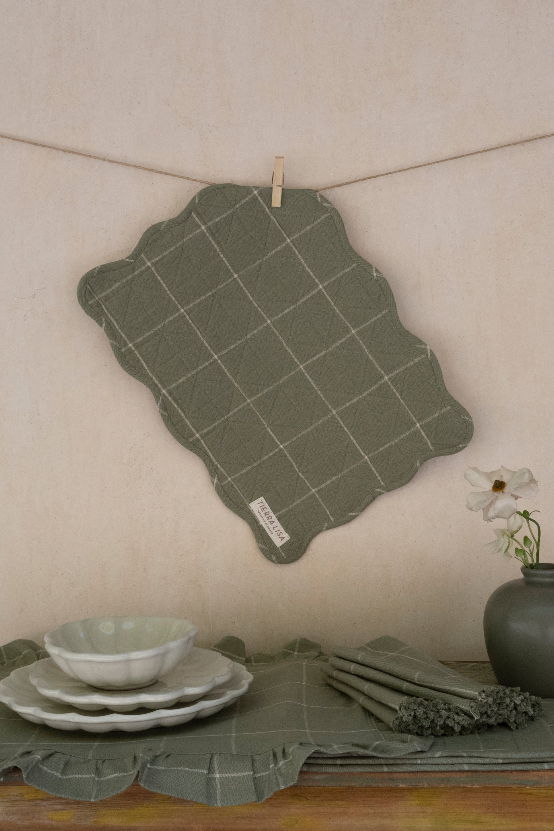 Individuales con forma de nube acolchados con borde festoneado color verde. Hechos a mano por artesanos en Chiapas, México, 100% algodón.