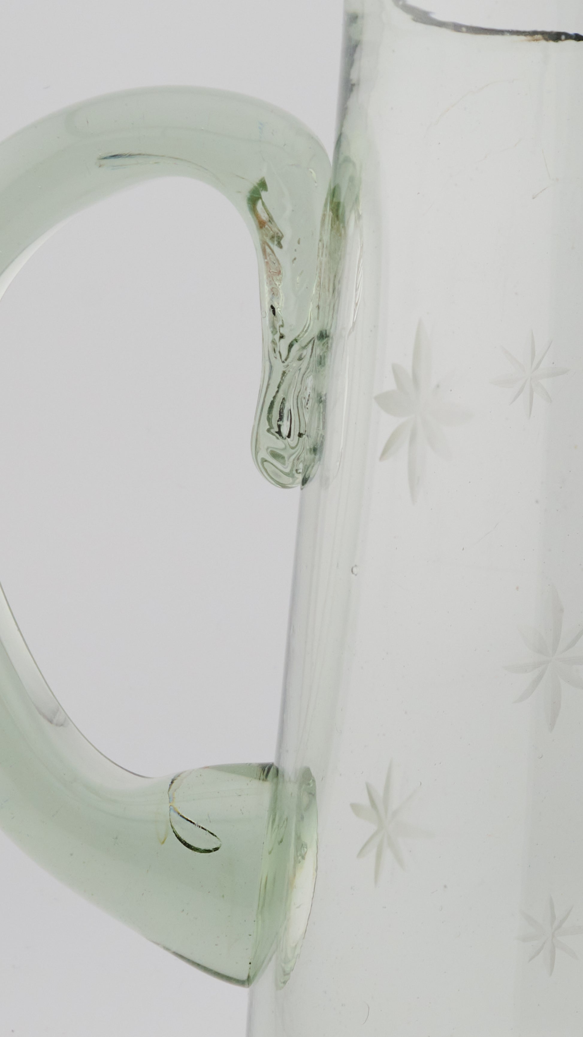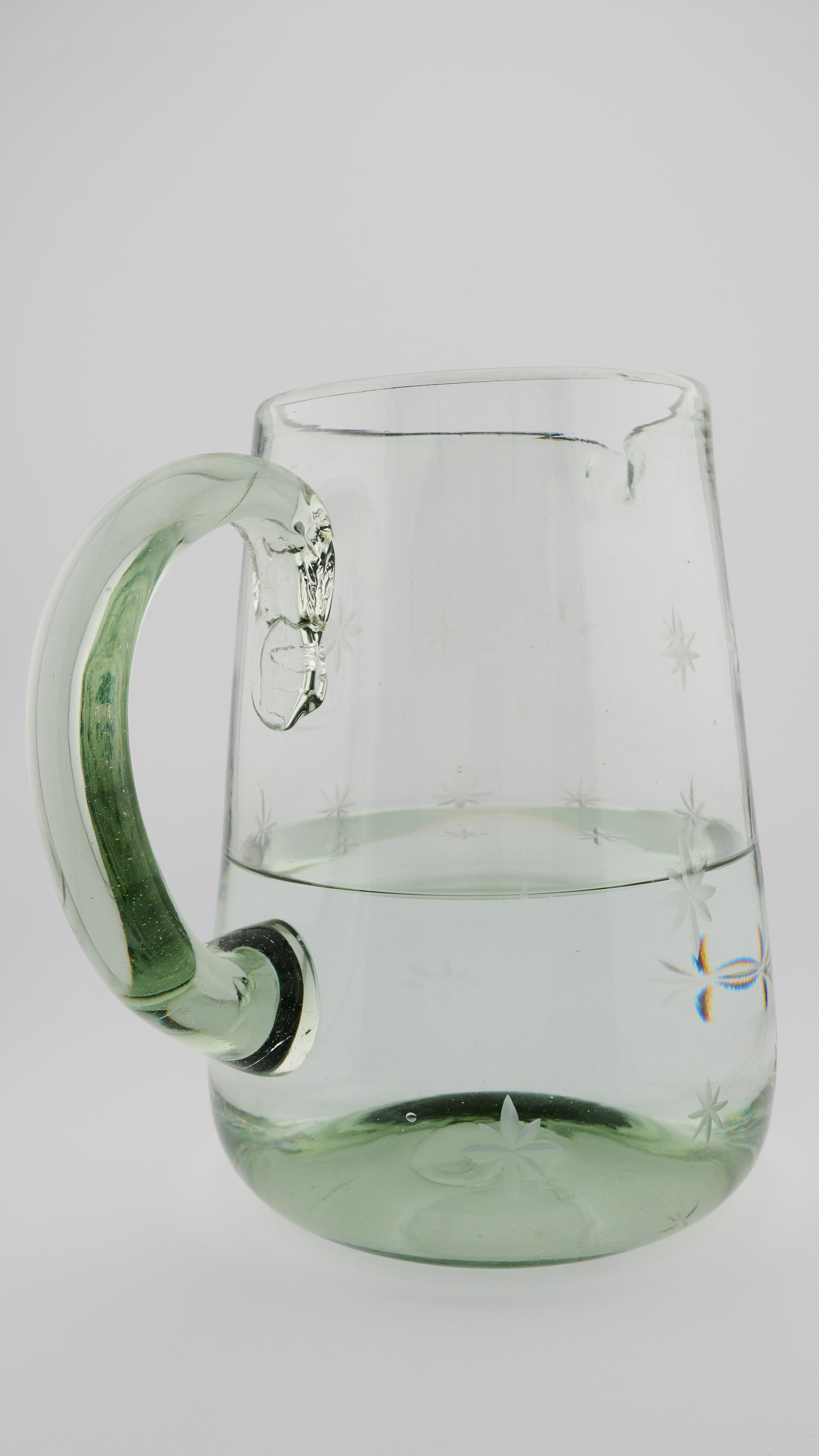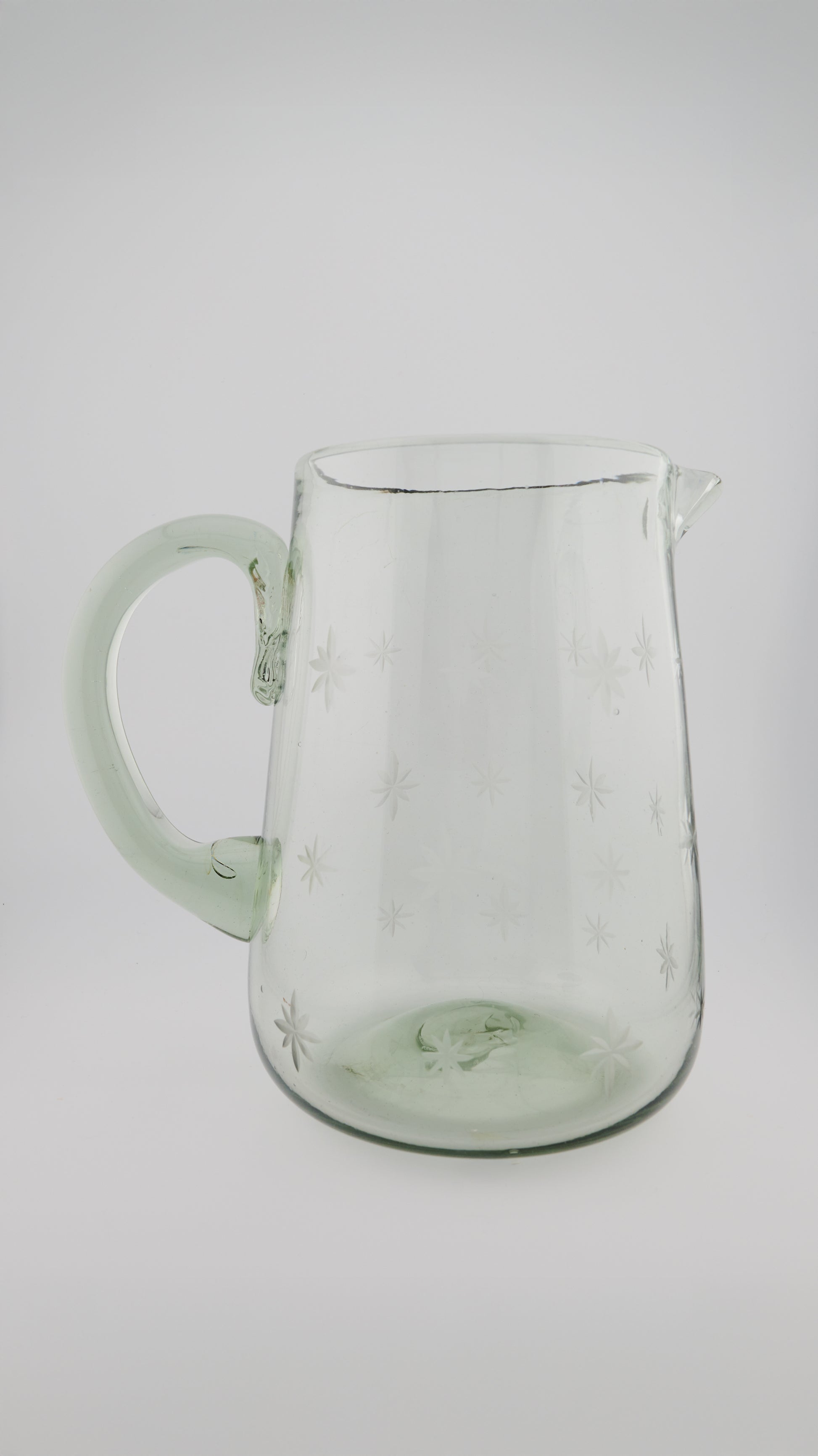 Jarra de vidrio transparente grabada de estrellas, elaborada artesanalmente con la técnica de vidrio soplado. Cada pieza es única y combina elegancia con un toque festivo, ideal para servir tus bebidas. Hecha en México con envío a todo el país.