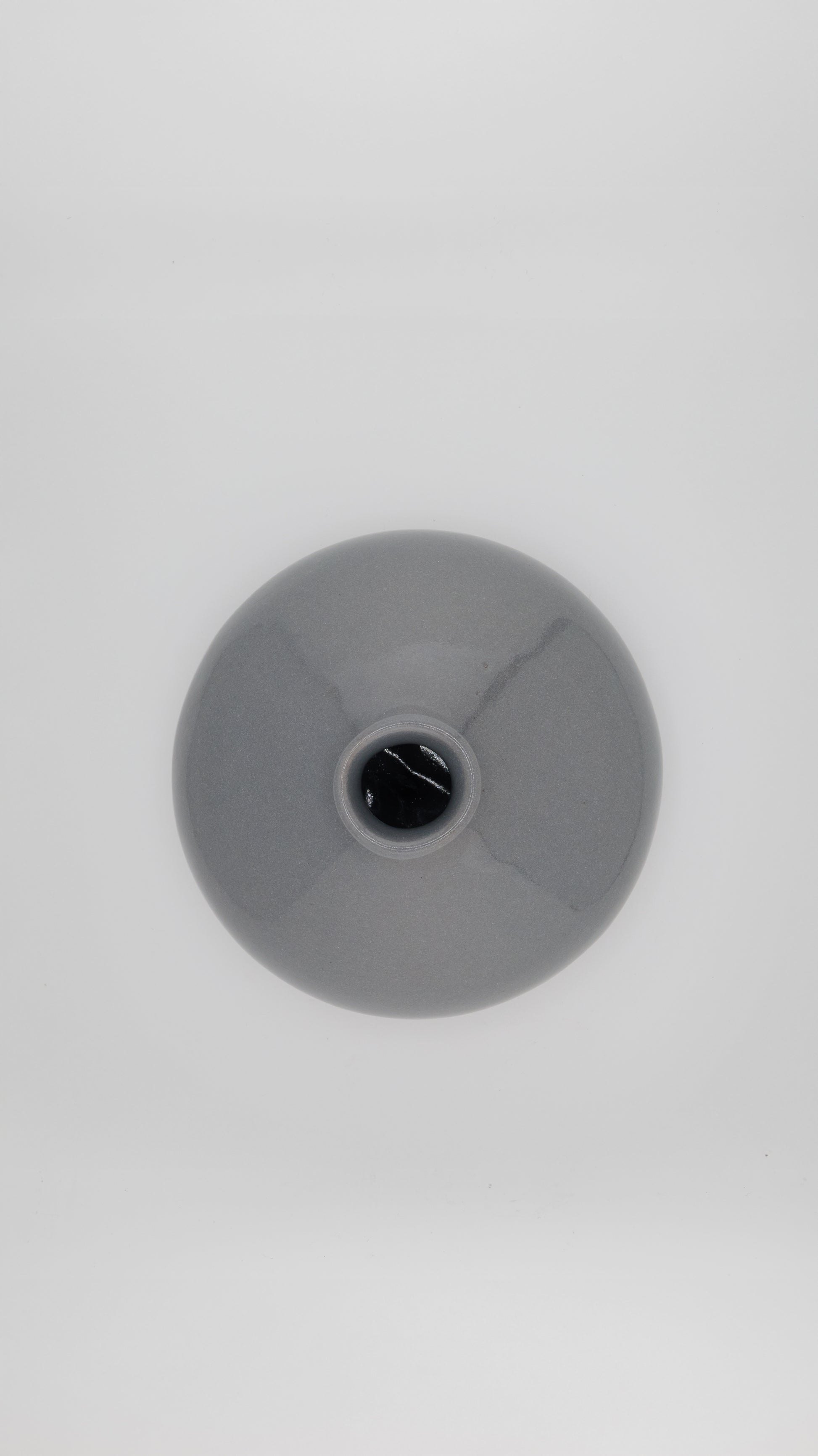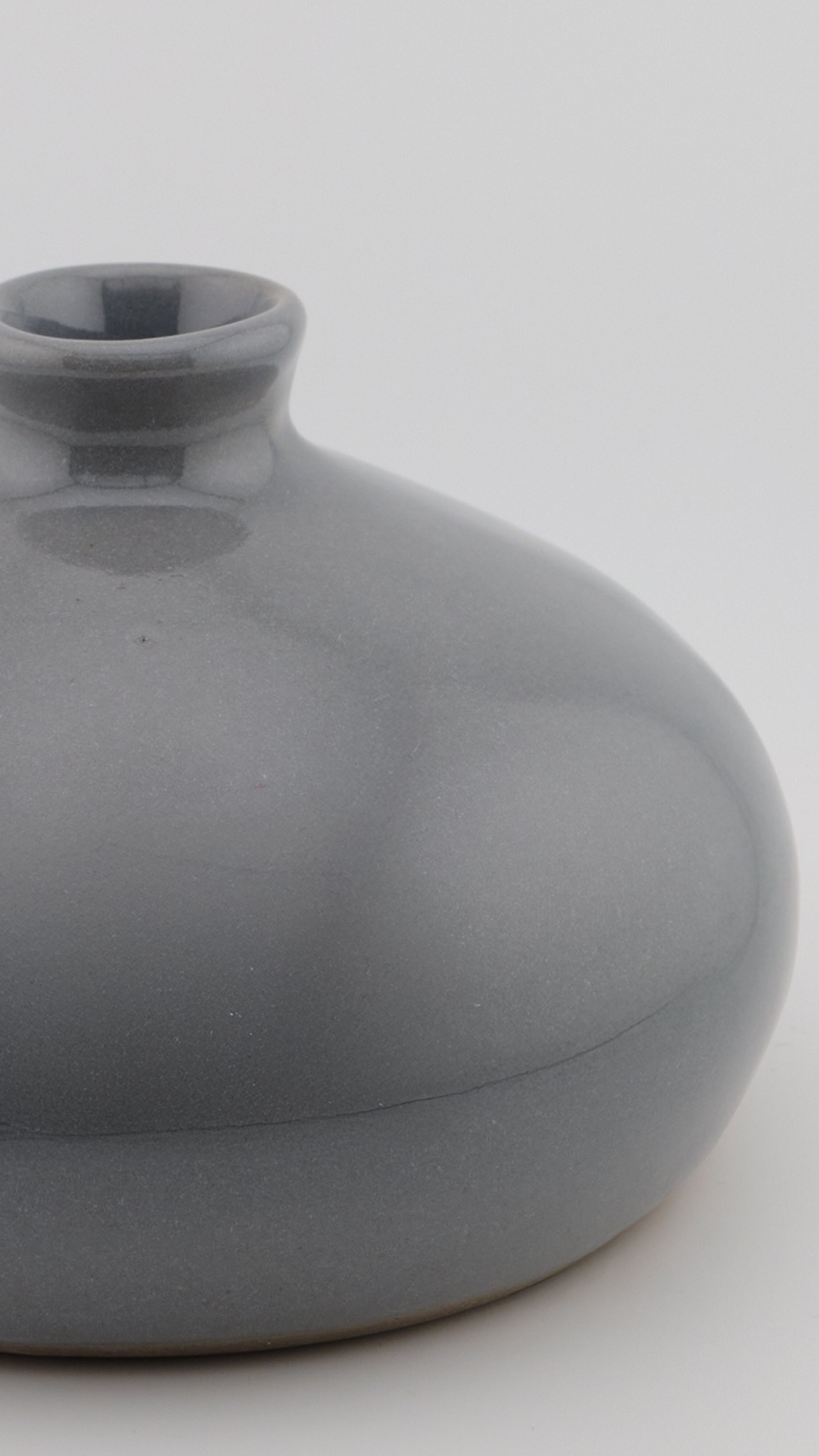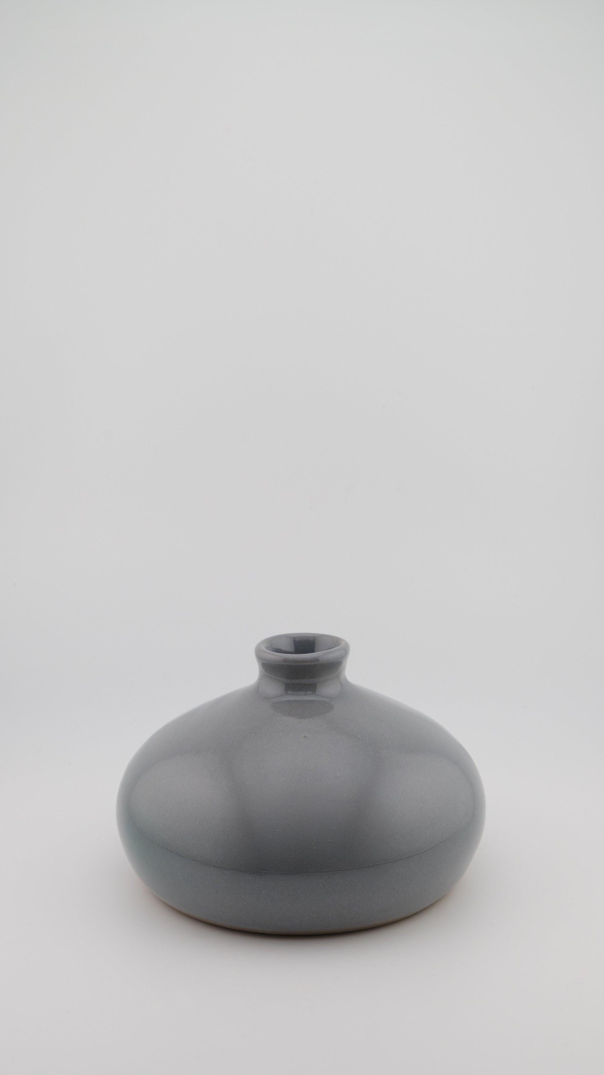 Jarrón de cerámica de alta temperatura con esmalte azul gris brillante. Su forma redondeada y cuello corto lo hacen ideal para colocar flores de tallo corto o como pieza decorativa sobre mesas o repisas. Cada pieza es modelada y esmaltada a mano, lo que la hace única. Hecho en México con envío a todo el país.