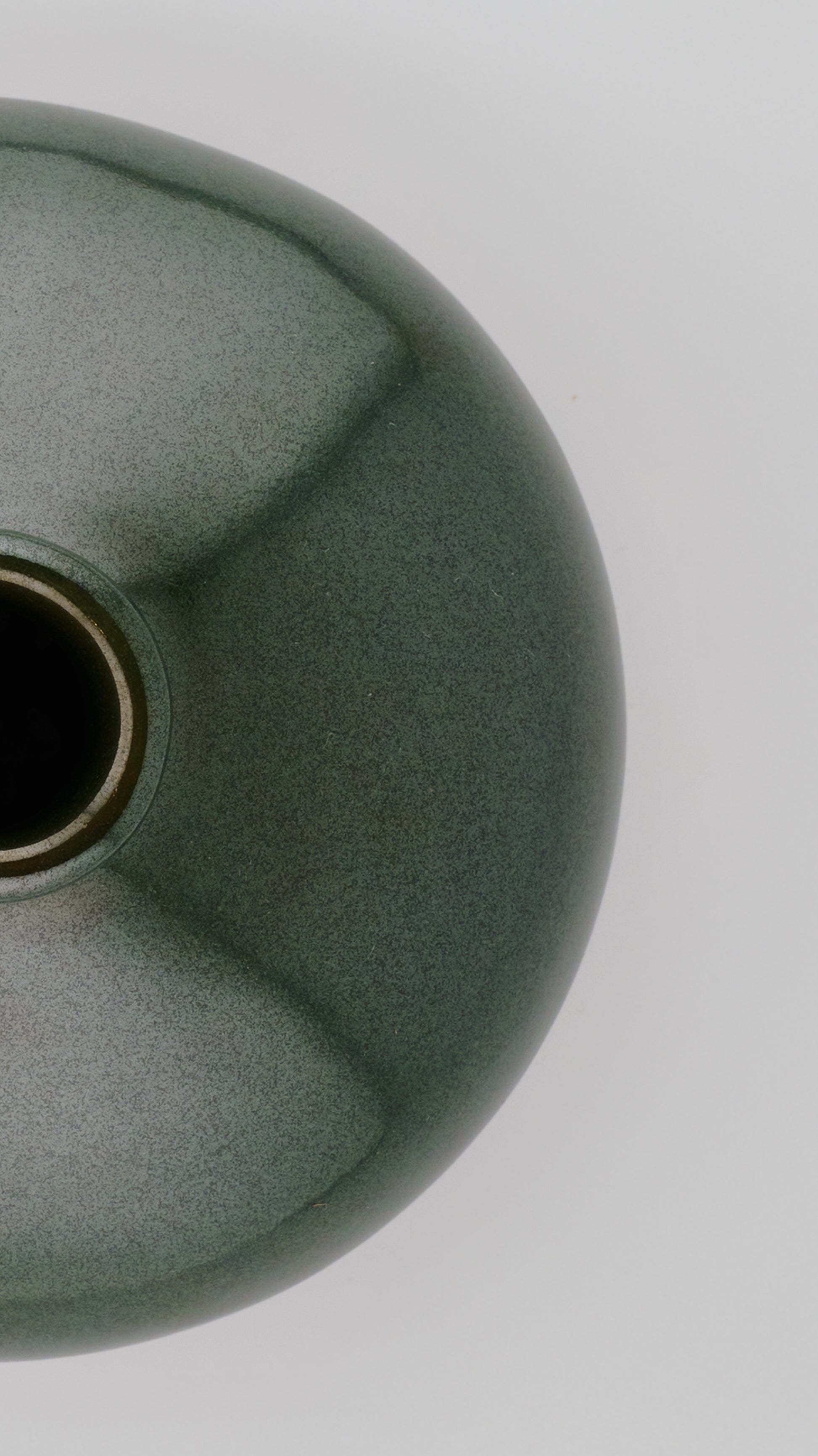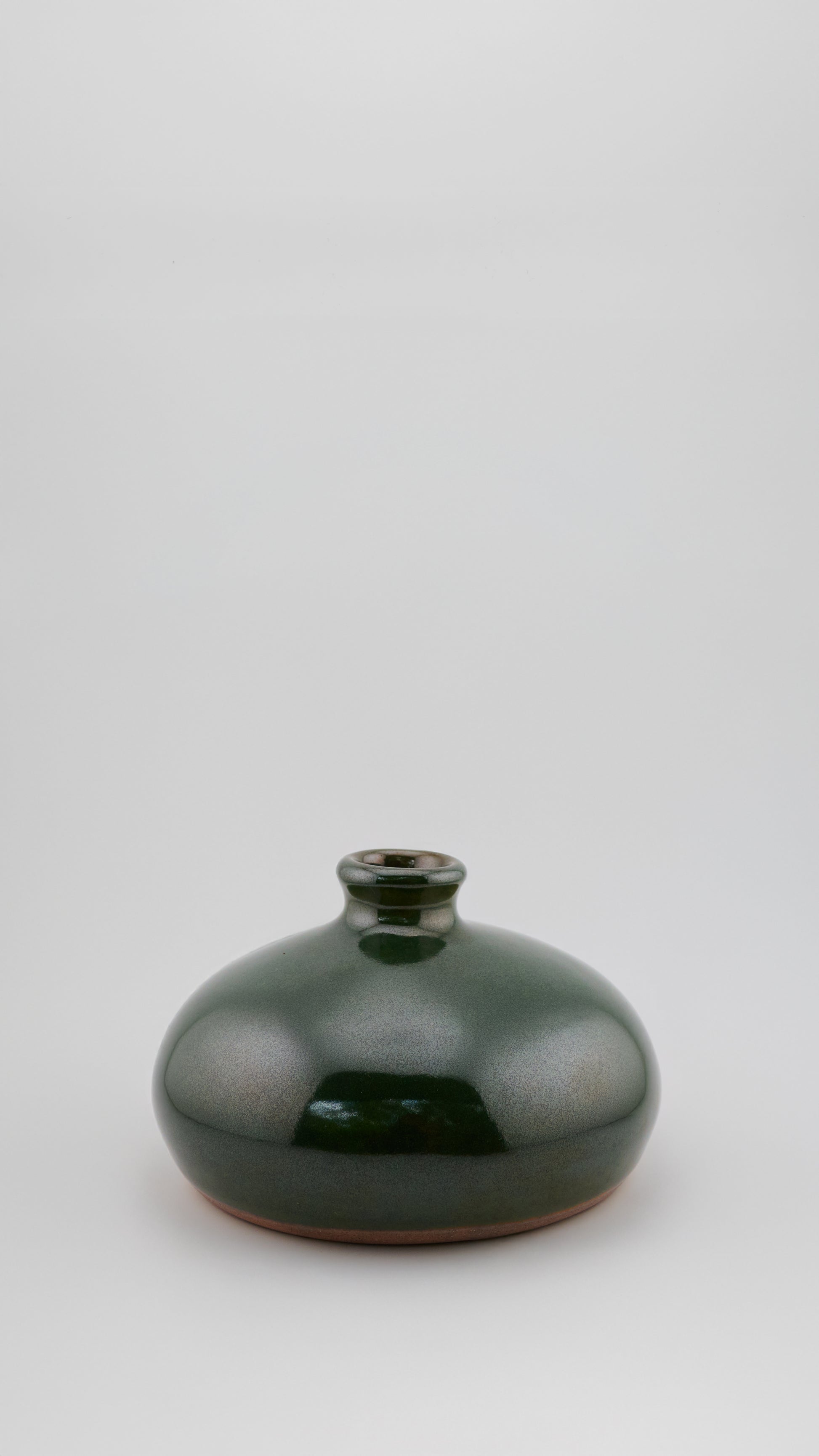 Jarrón de cerámica de alta temperatura con esmalte verde serrano brillante. Su forma redondeada y cuello corto lo hacen ideal para flores de tallo corto o como pieza decorativa sobre mesas o repisas. Cada pieza es modelada y esmaltada a mano, lo que la hace única. Hecho en México con envío a todo el país.