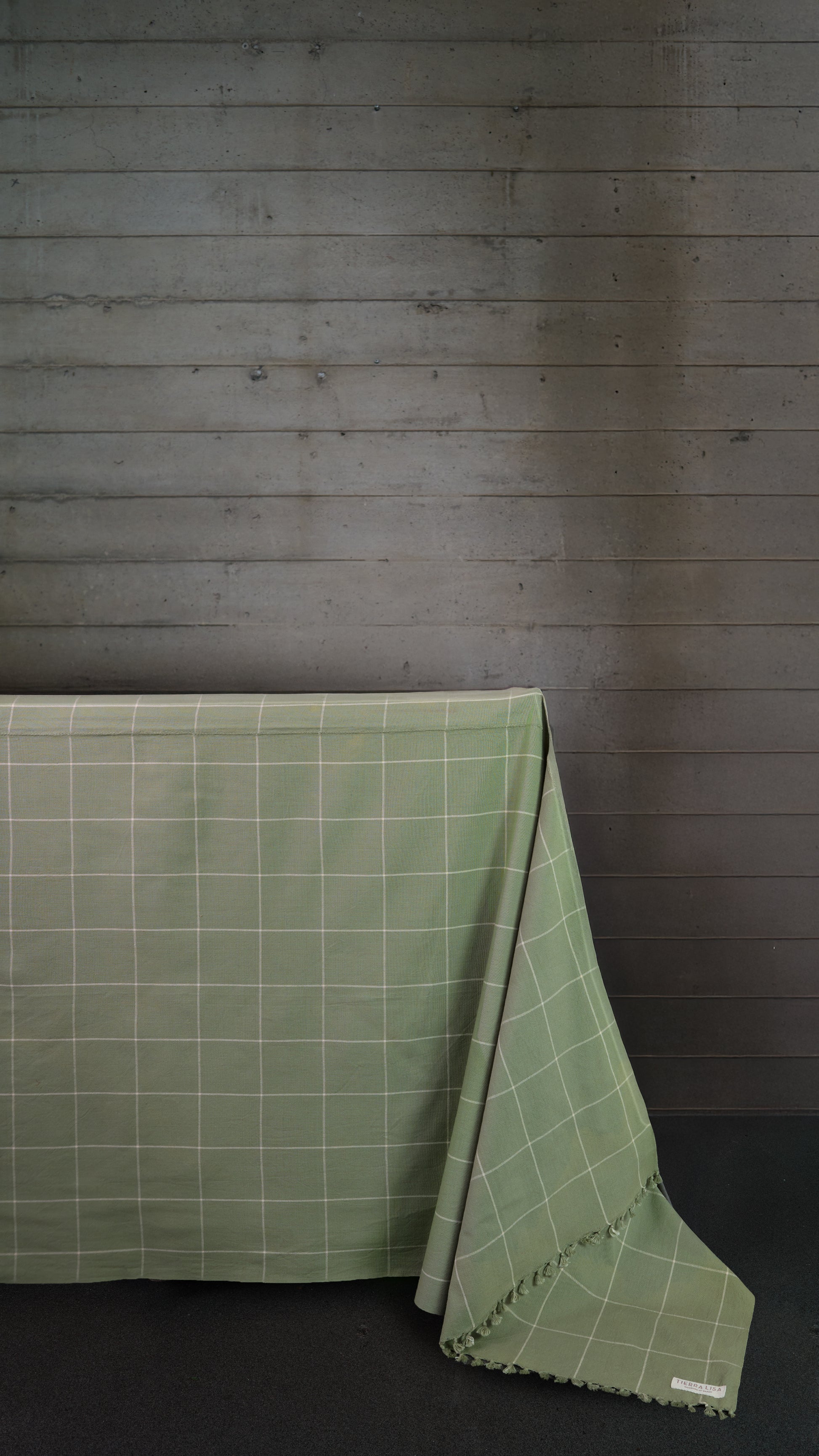 Mantel en tono verde con patrón de cuadros tejidos en telar. Su color natural y sereno aporta frescura a la mesa, ideal para comidas al aire libre o reuniones familiares. Confeccionado en lino y algodón por la artesana Ernestina en Chiapas, combina textura artesanal con un diseño contemporáneo. Hecho en México con envío a todo el país.