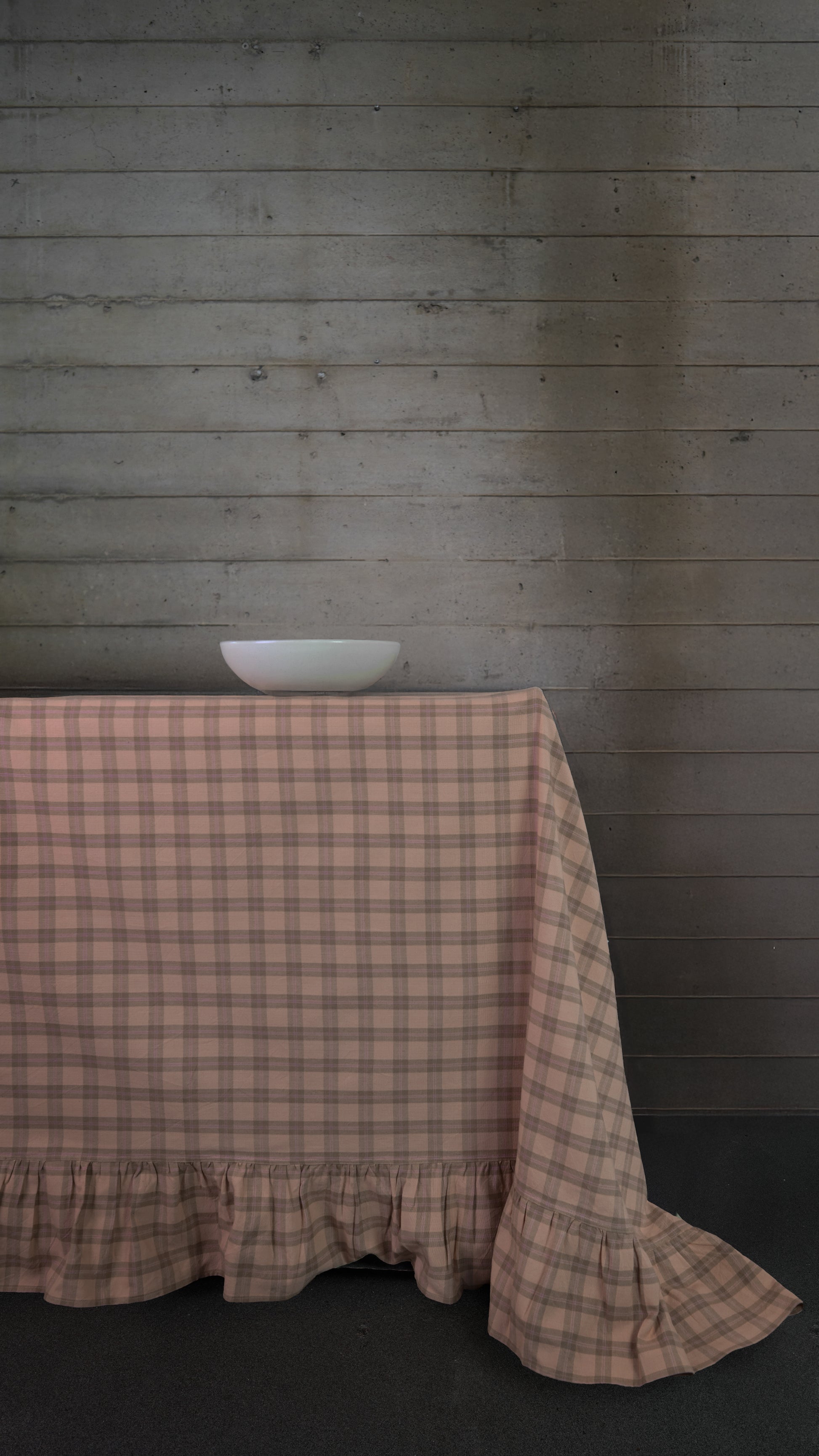 Mantel en tono nude con patrón de cuadros tejidos en telar y terminado con holán en el borde. Su diseño romántico y artesanal aporta movimiento y suavidad a la mesa, ideal para ocasiones especiales o para dar un toque acogedor a espacios cotidianos. Confeccionado en lino y algodón por la artesana Ernestina en Chiapas, cada pieza combina textura, volumen y dedicación manual. Hecho en México con envío a todo el país.