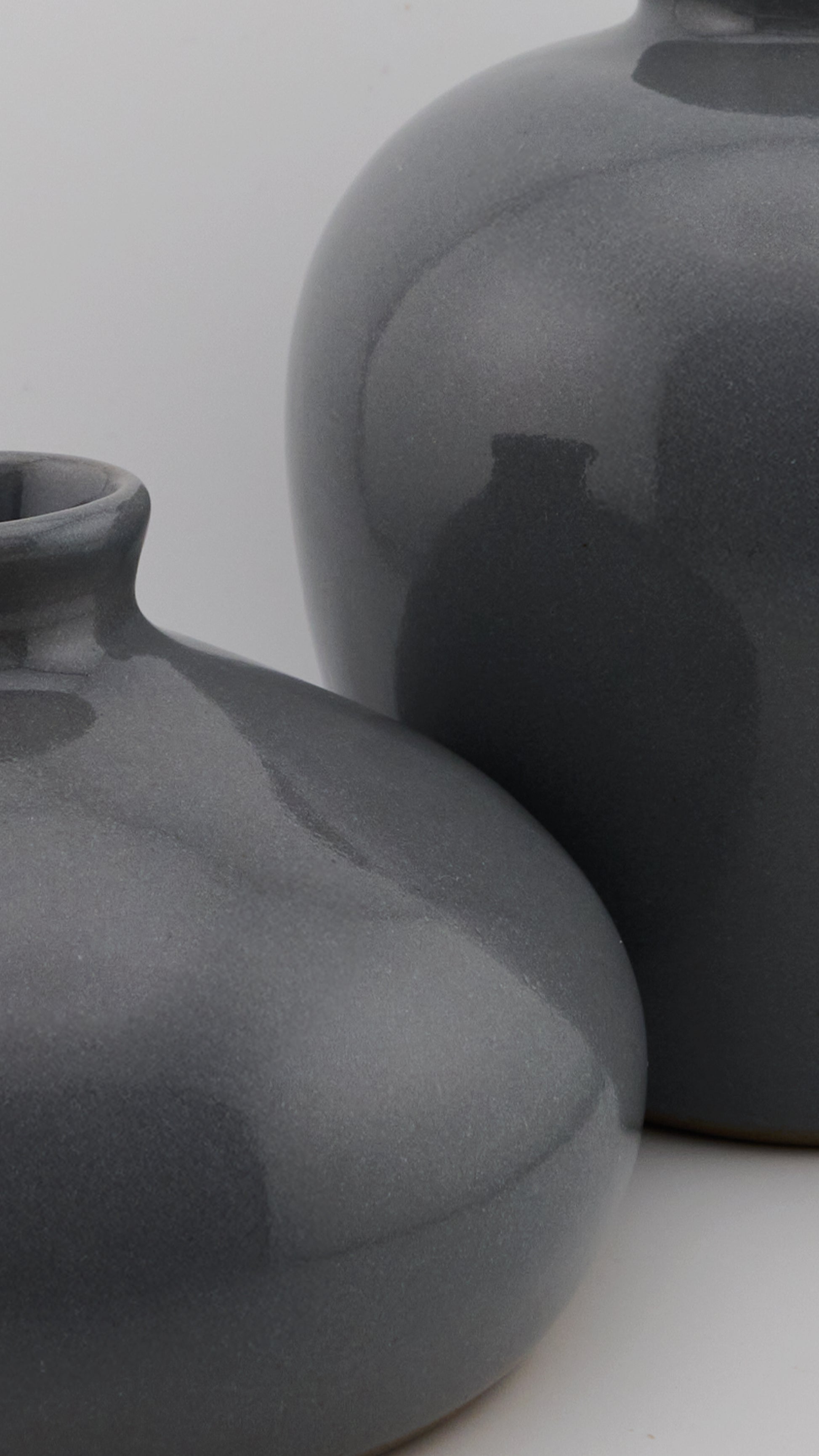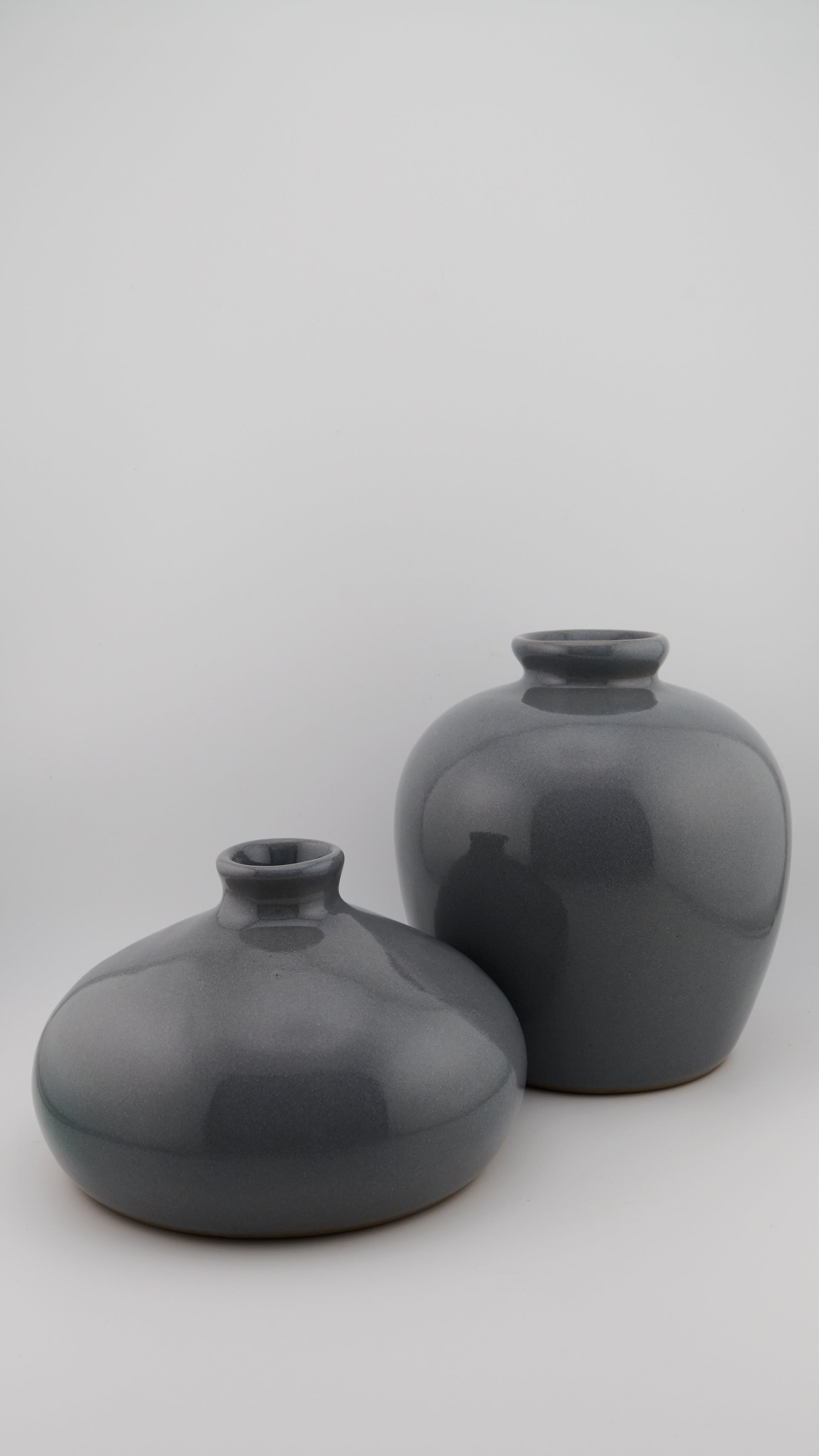 Set de dos jarrones de cerámica artesanal con esmalte azul brillante. Sus formas una ancha y otra ovalada aportan dinamismo y armonía a cualquier espacio. Ideales para usar como centro de mesa o como piezas decorativas individuales. Cada pieza es modelada y esmaltada a mano, lo que hace que cada set sea único. Incluye: