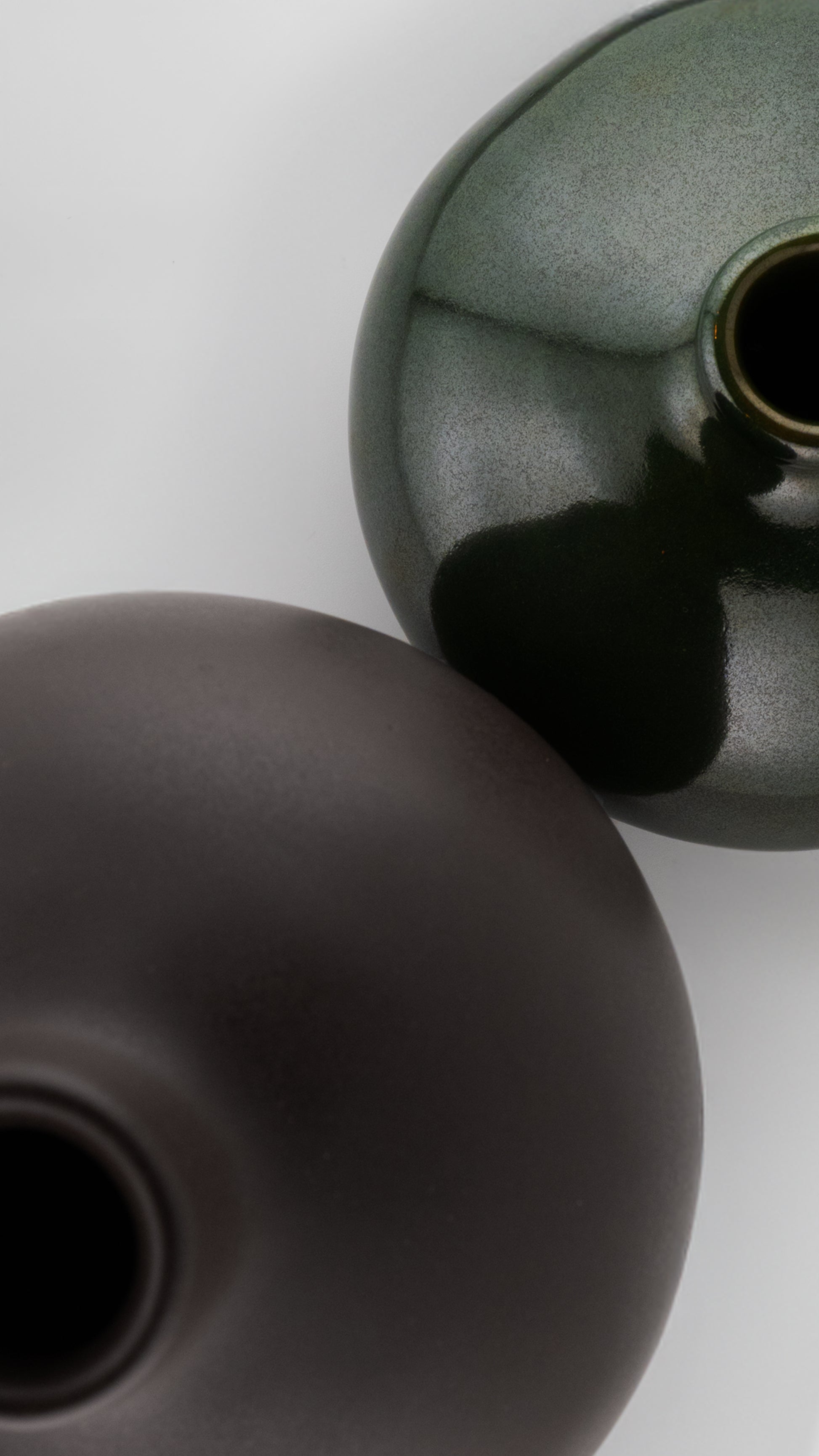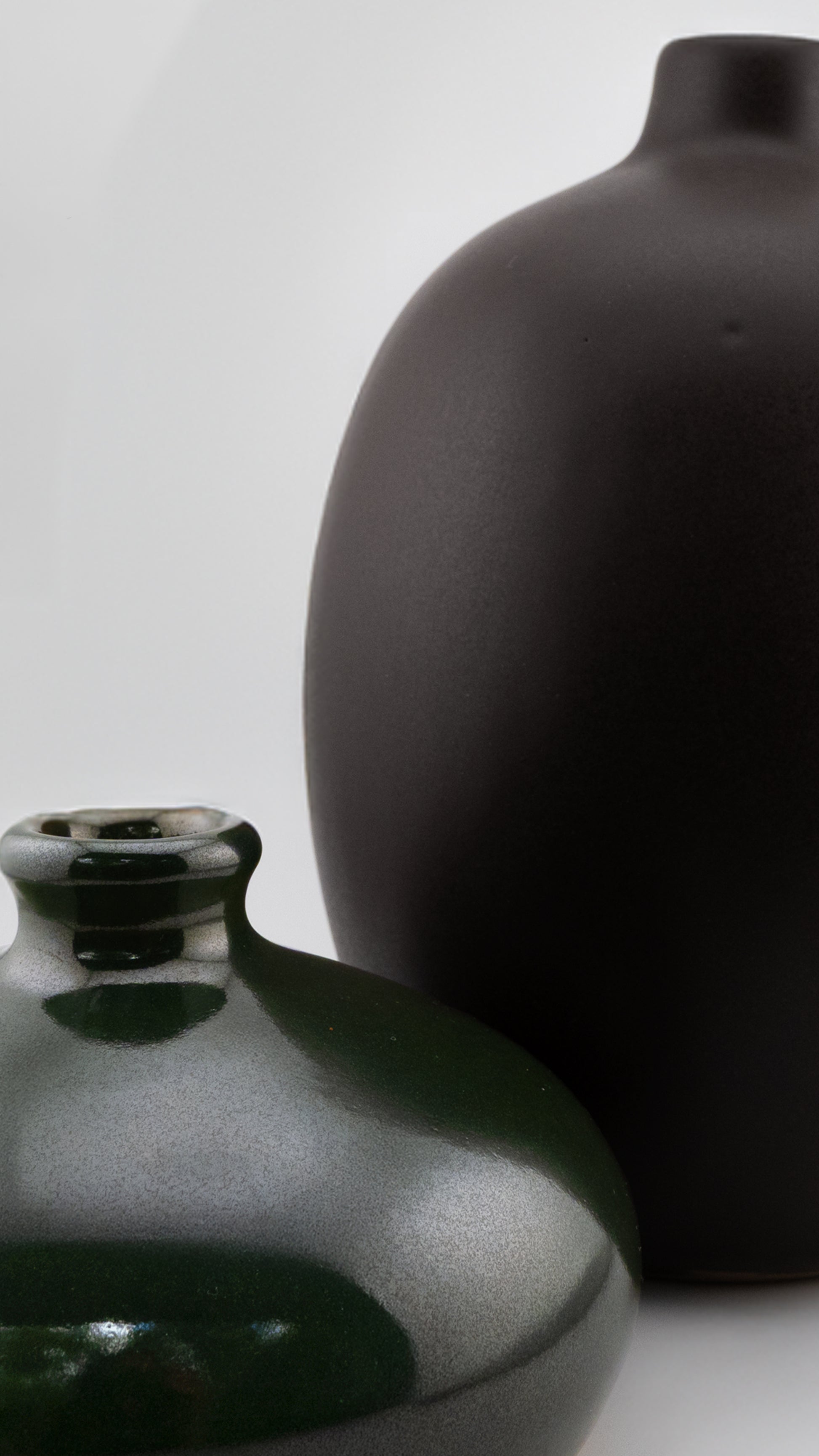 Un dúo que combina profundidad y elegancia. El jarrón en tono verde serrano brillante destaca por su esmalte con sutiles reflejos metálicos, mientras que el jarrón chocolate semimate aporta sobriedad y textura.