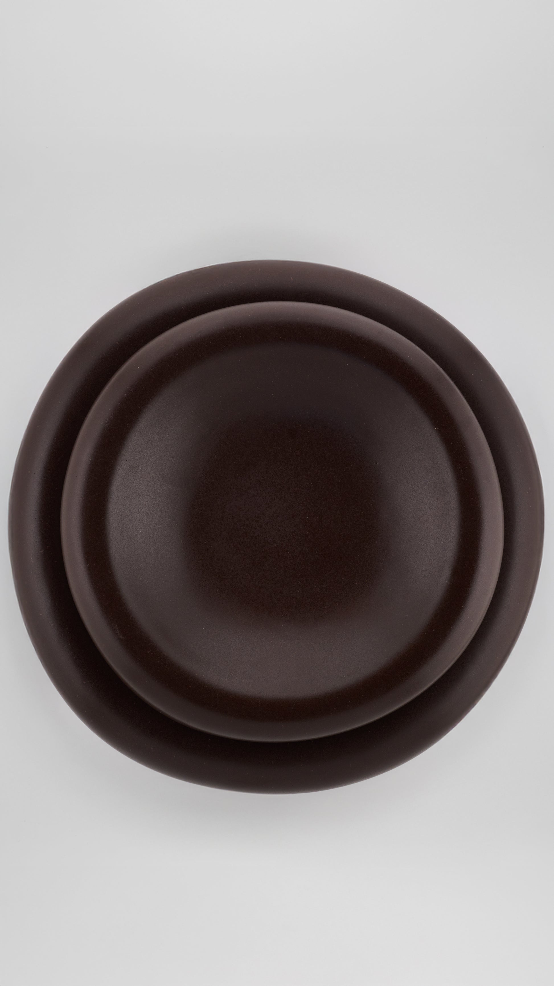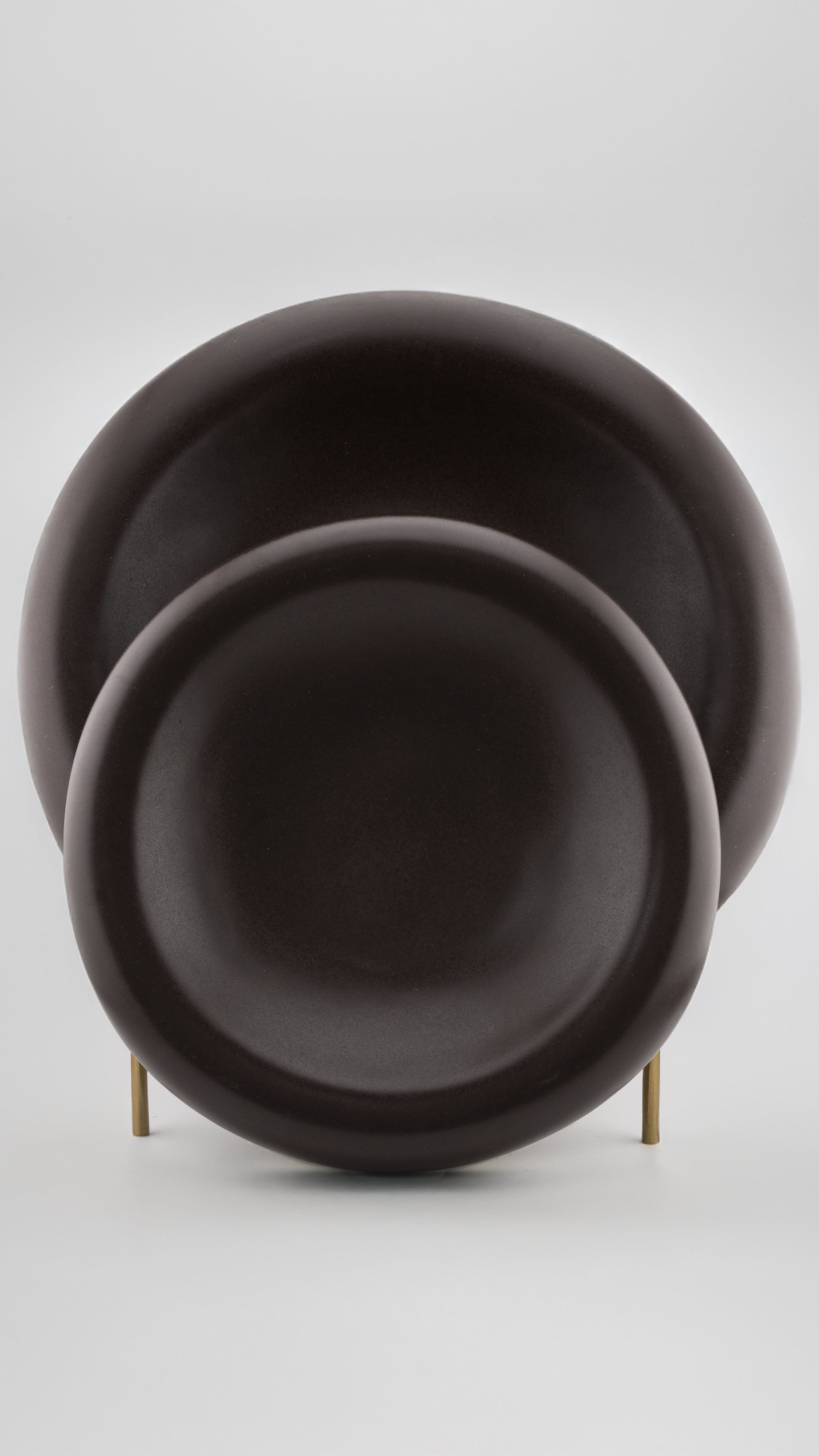 Un set versátil que celebra la funcionalidad y la estética. Las rosquillas en color chocolate semimate pueden usarse como platones para servir ensaladas con su aderezo al centro o como piezas decorativas sobre libros o repisas.