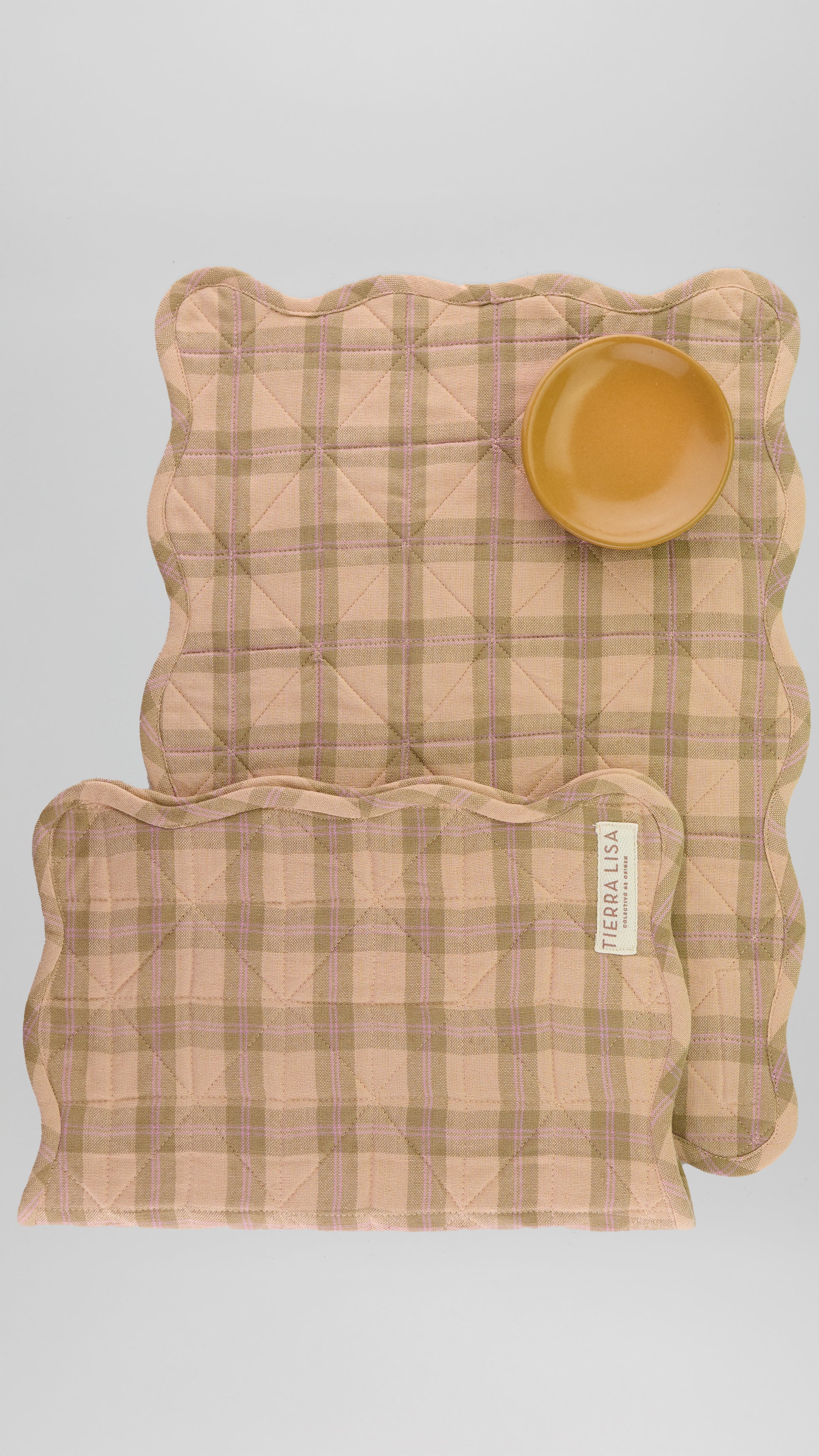 Set de 2 individuales acolchados en tono nude con detalles tejidos en verde y lila. Su diseño con borde en forma de nube y patrón de líneas naturales aporta calidez y textura a la mesa. Hechos con lino y algodón por la artesana Ernestina en Chiapas, cada pieza refleja un trabajo textil cuidadoso y artesanal. Perfectos para mesas acogedoras y combinaciones naturales. Hechos en México con envío a todo el país.