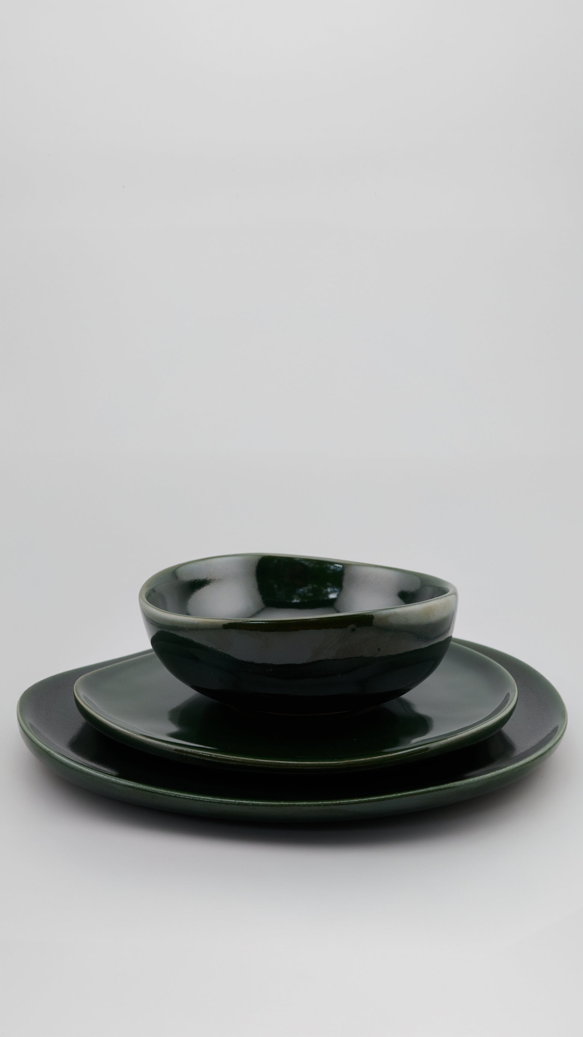 Set de 4 piezas de cerámica de alta temperatura con esmalte verde serrano brillante. Su diseño amorfo y bordes irregulares aportan un toque contemporáneo y orgánico a la mesa. Cada pieza está modelada y esmaltada a mano, lo que la hace única. Hecha en México con envío a todo el país.