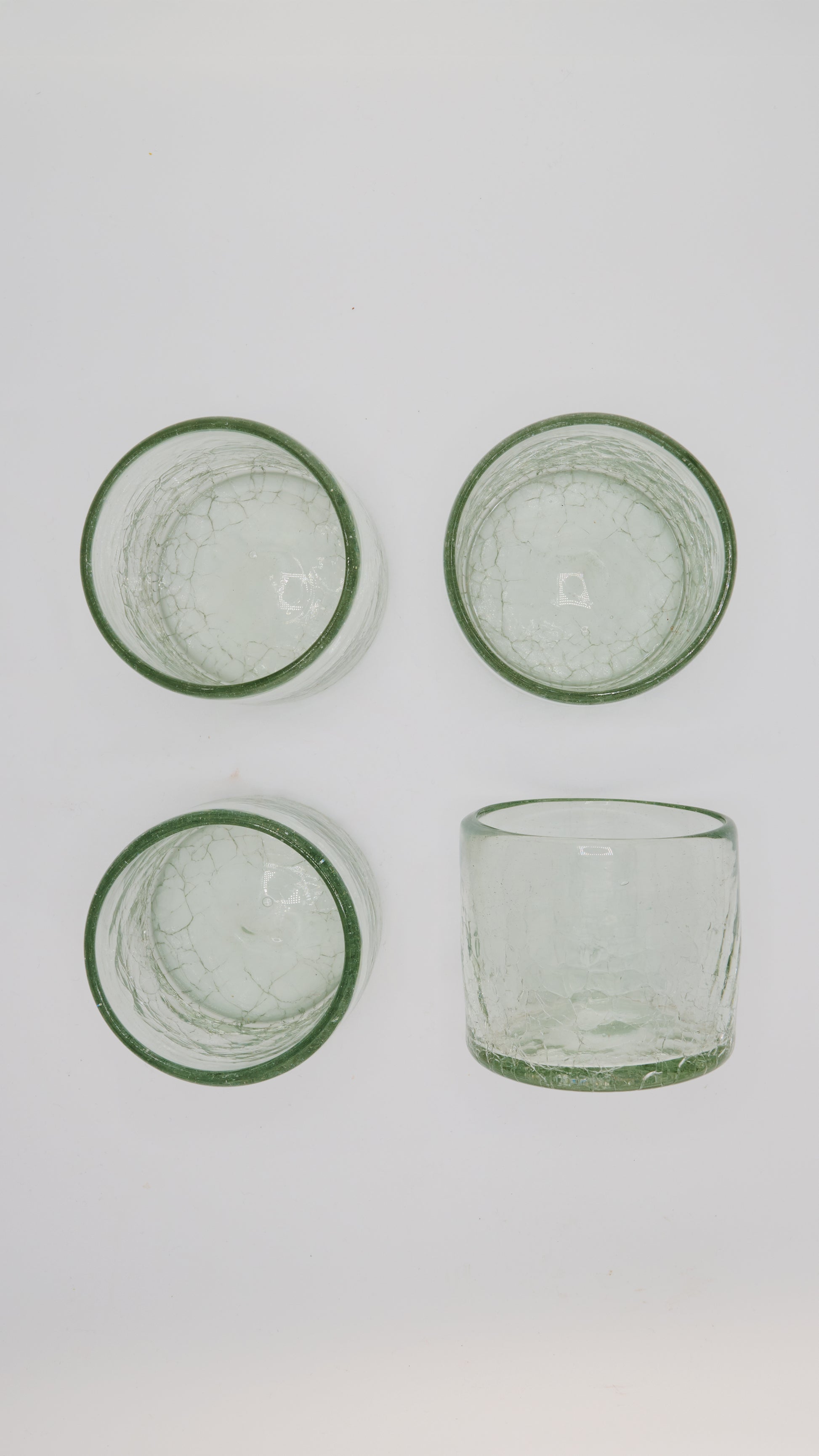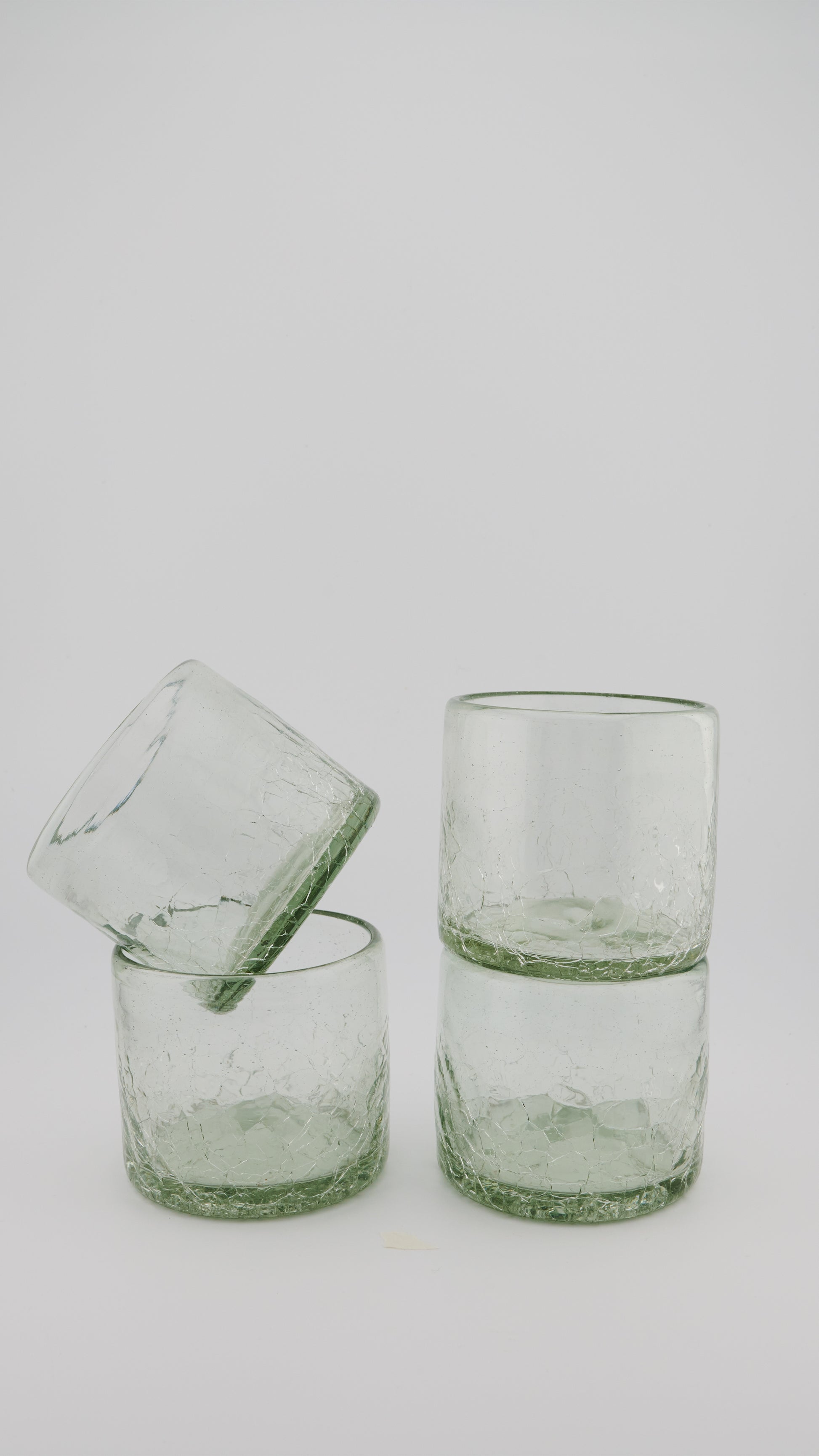 Set de 4 vasos de vidrio transparente con acabado craquelado, soplados artesanalmente uno a uno. Su textura irregular refleja la luz de forma única, aportando brillo y carácter a tu mesa. Perfectos para agua, jugos o cocteles. Hechos en México con envío a todo el país.