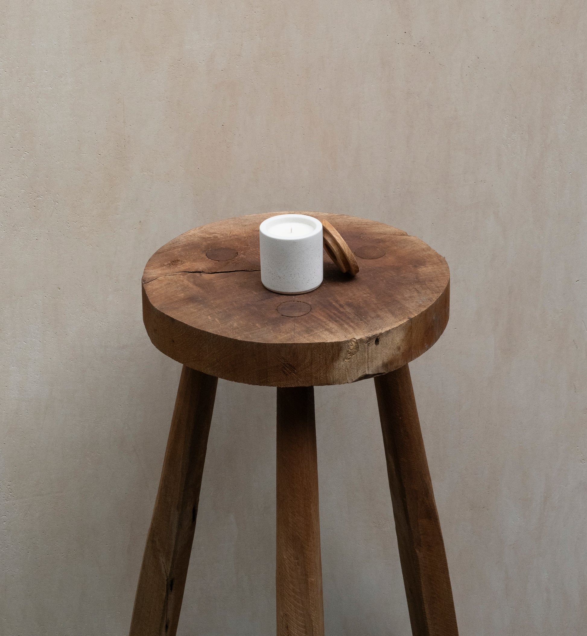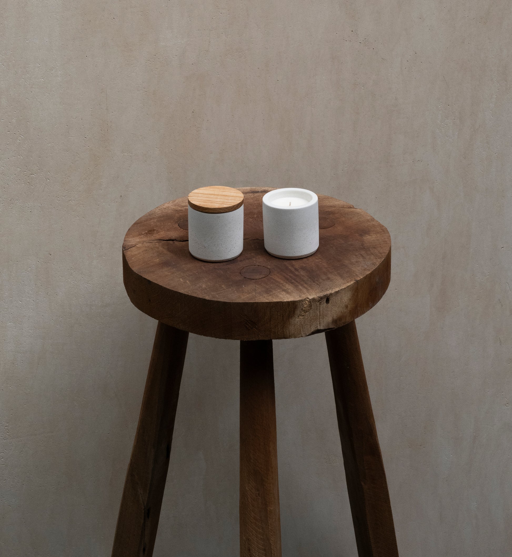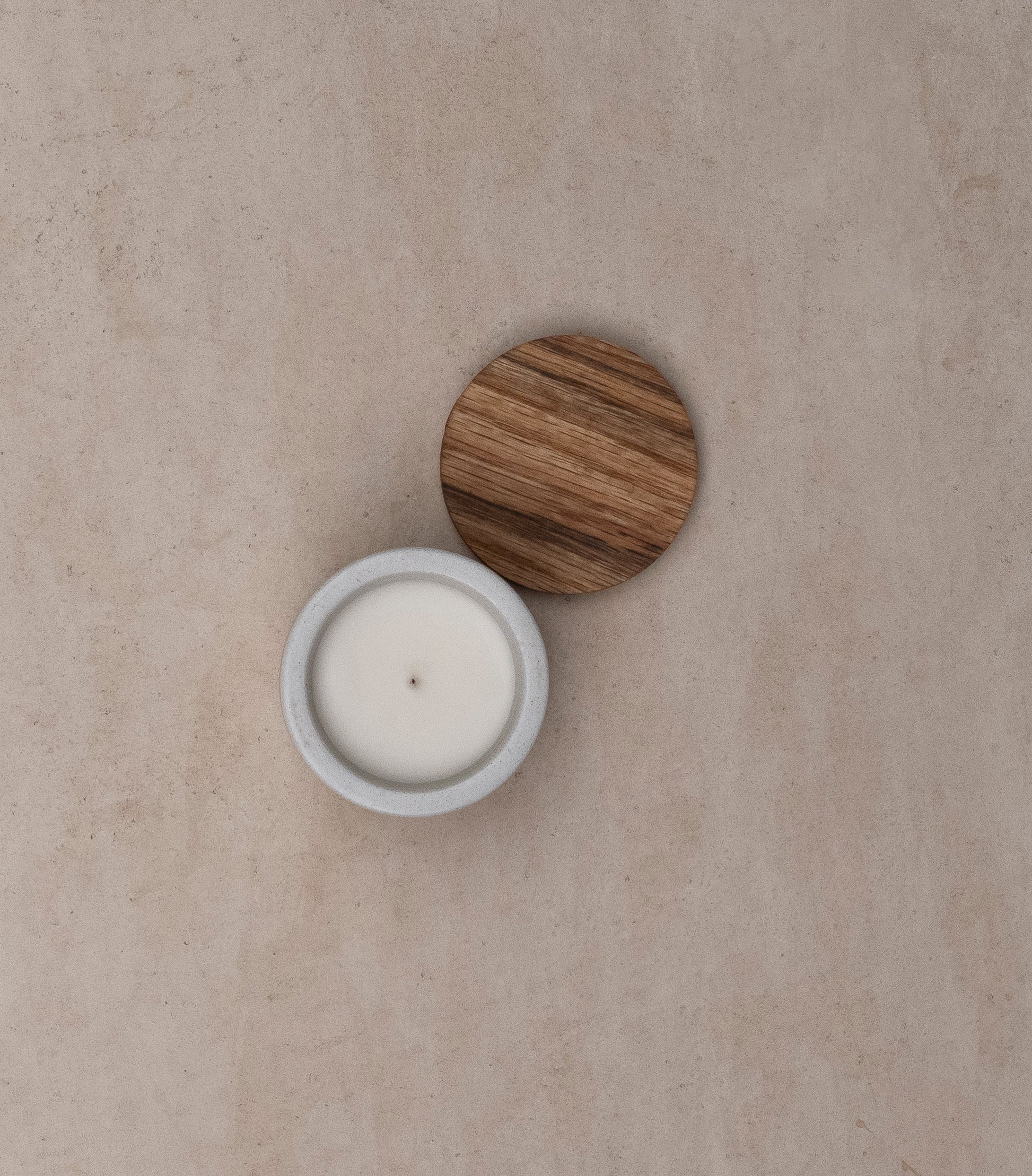 Vela chica color concreto, pabilo de algodón aroma eucalipto menta y salvia, con tapa de madera.